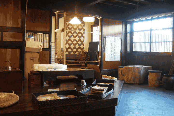 重厚な梁がむき出しの、吹き抜けになっている茶の間に座っていると、江戸時代にタイムスリップしたかのような錯覚におちいりそうです。